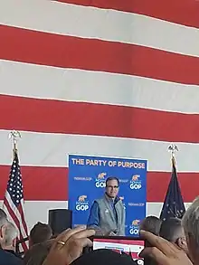 Braun won the Republican primary for the United States Senate in the 2018 election, defeating U.S. Representatives Todd Rokita and Luke Messer[19][20] by over 56,000 votes. He received 208,520 votes, or roughly 41% of the total.[2] Braun ran as an outsider, emphasizing his career in business.[21] He defeated Democratic incumbent Joe Donnelly in the November general election[22] with 51% of the vote to Donnelly's 45%; the Libertarian candidate, Lucy Brenton, tallied less than 4%.[23] In late 2019, the Indianapolis Star reported that Braun's 2018 campaign was the beneficiary of $2.8 million in spending by a political action committee with strong connections to indicted money launderer Lev Parnas and one of his shell companies.[24] Parnas supplied photographs of him and Braun embracing at a 2018 campaign event to the House of Representatives as part of his cooperation with the impeachment of President Trump. They were made public in January 2020.[24]