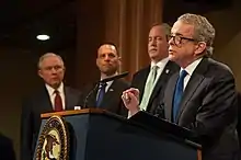 On August 4, 2019, a mass shooting occurred in Dayton, Ohio, that killed ten people and injured 27 others; this followed a mass shooting in El Paso, Texas by just 13 hours.[54] At a vigil for the victims of the Dayton shooting the next day, DeWine was drowned out by a crowd chanting "Do something!"; the chant referred to the lack of legislative gun control actions on the state and federal level.[54] On August 6, DeWine proposed to allow judges to confiscate firearms from those deemed potentially dangerous and to provide them with mental health treatment while maintaining their due process rights.[55][56][57] Other notable aspects of DeWine's plan include expanded background checks before purchasing a firearm, increased access to psychiatric and behavioral health services, and increased penalties for illegally possessing firearms.[55][56][57]
