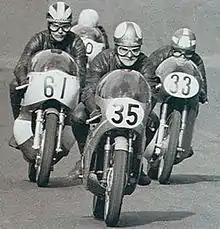 By 1961, Hailwood was racing for up-and-coming Japanese factory Honda. In June 1961, he became the first man in the history of the Isle of Man TT to win three races in one week when he won in the 125 cc, 250 cc and 500 cc categories.[8] He lost the chance at winning a fourth race when his 350 AJS failed with a broken gudgeon pin whilst leading. Riding a four-stroke, four-cylinder 250 cc Honda, Hailwood won the 1961 250cc world championship.[9]