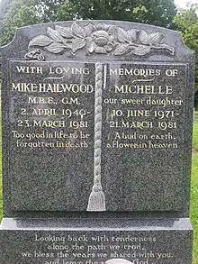 On Saturday 21 March 1981, Hailwood set off in his Rover SD1 with his children Michelle and David to collect some fish and chips. As they returned along the A435 Alcester Road through Portway, Warwickshire,[51] near their home in Tanworth-in-Arden, a lorry made an illegal turn through the barriers onto the central reservation, and their car collided with it. Michelle, aged nine, was killed instantly. Mike and David were taken to hospital, where Mike died two days later from severe internal injuries.[52] He was 40 years old. David survived with minor injuries. The lorry driver was fined £100.