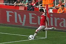 Arteta signed with Arsenal on 31 August 2011 on a four-year deal for a reported fee of £10 million.[29] He made his debut on 10 September in a 1–0 home win against Swansea City,[30] and scored his first Premier League goal for Arsenal in a 4–3 loss against Blackburn Rovers at Ewood Park.[31] Arteta got his first chance to captain the Gunners in the third-round FA Cup victory over Leeds United, a game in that marked the second Arsenal debut of Thierry Henry. Arteta suffered an ankle sprain in his side's 2–1 loss to Wigan Athletic on 16 April, which sidelined him for the remainder of the season.[32] Despite this he made 29 appearances all season, scoring 6 times, and was voted by the fans as the fifth most important player of the 2011–12 campaign in Arsenal's Player of the Season poll.[33]