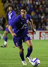 Midway through the 2000−01 season, Arteta went to French club Paris Saint-Germain on an 18-month loan.[4] He joined a star-studded team managed by Luis Fernandez, a team which included the likes of Mauricio Pochettino, Gabriel Heinze, Jay-Jay Okocha and Nicolas Anelka. Arteta would also later play with Ronaldinho when the Brazilian moved to Paris in the summer of 2001.[5] He made his senior debut on 10 February 2001 against Auxerre in the round of 32 of the 2000−01 Coupe de France.[6] Arteta started the match at the Parc des Princes and played the entire game in which PSG lost 4−0. On 17 February 2001, Arteta made his French Division 1 debut coming off the bench in the 34th minute for Vampeta in a 1−0 defeat against rivals Marseille, away at the Stade Vélodrome.[7] Arteta was used by Fernández primarily as a playmaker during his time in Paris,[8] he played 11 games in his first season and he scored his first senior goal on 12 May 2001 against Lille.[9] During Arteta's second season with PSG, he won the 2001 UEFA Intertoto Cup in the summer, watching both two-legged final games against Brescia from the bench.[10] He played 53 games in total for PSG and scored five goals.[11] PSG wanted to keep Arteta at the end of the loan period, and did have first refusal on the player.[12][13] Instead, he returned to Barcelona after his loan spell.