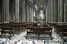 Visconti had ambitions to follow the newest trends in European architecture. In 1389, a French chief engineer, Nicolas de Bonaventure, was appointed, adding to the church its Rayonnant Gothic. Galeazzo gave the Fabbrica del Duomo exclusive use of the marble from the Candoglia quarry and exempted it from taxes. Ten years later another French architect, Jean Mignot, was called from Paris to judge and improve upon the work done, as the masons needed new technical aid to lift stones to an unprecedented height.[9] Mignot declared all the work done up until then as in pericolo di ruina ("peril of ruin"), as it had been done sine scienzia ("without science"). In the following years, Mignot's forecasts proved untrue, but they spurred Galeazzo's engineers to improve their instruments and techniques. However, relations between Gian Galeazzo and the top management of the factory (chosen by the citizens of Milan) were often tense: the lord (who in 1395 had become Duke of Milan) intended to transform the cathedral into the dynastic mausoleum of the Visconti, inserting the central part of the cathedral funeral monument of his father Galeazzo II and this met with strong opposition from both the factory and the Milanese, who wanted to underline their autonomy. A clash arose, which forced Gian Galeazzo to decide on the foundation of a new construction site intended exclusively for the Visconti dynasty: the Certosa di Pavia.[10] Work proceeded quickly, and at the death of Gian Galeazzo in 1402, almost half the cathedral was complete. Construction, however, stalled almost totally until 1480, for lack of money and ideas: the most notable works of this period were the tombs of Marco Carelli and Pope Martin V (1424) and the windows of the apse (1470s), of which those extant portray St. John the Evangelist, by Cristoforo de' Mottis, and Saint Eligius and San John of Damascus, both by Niccolò da Varallo. In 1452, under Francesco Sforza, the nave and the aisles were completed up to the sixth bay.