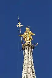 In 1762 one of the main features of the cathedral, the Madonnina's spire, was erected at the dizzying height of 108.5 m. The spire was designed by Carlo Pellicani and sports at the top a famous polychrome Madonnina statue, designed by Giuseppe Perego that befits the stature of the cathedral.[13] Given Milan's notoriously damp and foggy climate, the Milanese consider it a fair-weather day when the Madonnina is visible from a distance, as it is so often covered by mist.