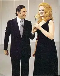 Canzonissima 1968 was a Saturday night prime time variety show that aired on Rai Uno from September 1968 to January 1969. It was hosted by Mina, Walter Chiari and Paolo Panelli.[58] The orchestrations were scored by the conductors Bruno Canfora and Augusto Martelli. "Sacumdì Sacumdà", Mina's talking and laughing version of Carlos Imperial's bossa nova "Nem Vem Que Não Tem", narrowly escaped a ban by RAI because of its irreverent lyrics. The song was performed as part of a musical fantasy, back to back with "Quelli che hanno un cuore", her intense version of "Anyone Who Had a Heart".[59] Another interpretation of a Dionne Warwick song was "La voce del silenzio" ("Silent Voices") by Paolo Limiti and Elio Isola, presented in a live session during the show.[25] "Niente di niente" ("Nothing at All") was her version of the Delfonics' "Break Your Promise". The series also included the songs "Fantasia", "La musica è finita" ("The Music is Over") and the elegant "Un colpo al cuore" ("Heart Attack"). "Un colpo al cuore" ended up as No. 68 on the best-selling singles chart for that year in Italy.[60] Each show was closed by Mina singing "Vorrei che fosse amore" ("Wish It Was Love"), a piece of atmospheric music by Bruno Canfora that was No. 50 on the best-selling singles chart for 1968 in Italy.[60] A selection of songs from the series were issued as the album Canzonissima '68.[59]
