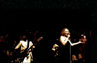 Mina backed by the orchestra conducted by bassist/arranger Pino Presti on occasion of her last public performances at the Bussoladomani Theatre in 1978.