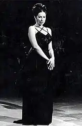 Mina Anna Maria Mazzini OMRI (born 25 March 1940) or Mina Anna Quaini (for the Swiss civil registry),[2][4] known mononymously as Mina, is an Italian singer and actress. She was a staple of television variety shows[5] and a dominant figure in Italian pop music from the 1960s to the mid-1970s,[6] known for her three-octave vocal range,[7] the agility of her soprano voice,[7] and her image as an emancipated woman.[8]