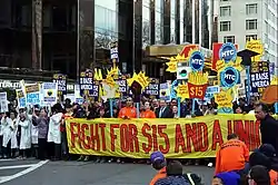 In the business sector, concerns include the expected increased cost of doing business, threats to profitability, rising levels of unemployment (and subsequent higher government expenditure on welfare benefits raising tax rates), and the possible knock-on effects to the wages of more experienced workers who might already be earning the new statutory minimum wage, or slightly more.[37] Among workers and their representatives, political considerations weigh in as labor leaders seek to win support by demanding the highest possible rate.[38] Other concerns include purchasing power, inflation indexing and standardized working hours.
