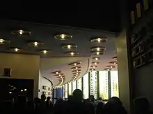 The theater is accessed from a covered arcade under the center of One Astor Plaza,[7][8] which connects 44th and 45th Streets.[9][10] The escalators from the arcade lead to the third-floor grand foyer, which has a glass wall overlooking Times Square. Additional escalators lead from here to the seating areas. The grand foyer has bars and coat checks.[11] The glass-walled lobby has also been used for weddings but, according to a 1977 feature in the New York Daily News, weddings were not allowed during performances of shows.[12]