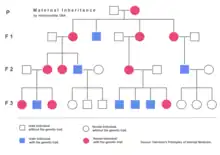 Example of a pedigree for a genetic trait inherited by mitochondrial DNA in animals and humans. Offspring of the males with the trait don't inherit the trait. Offspring of the females with the trait always inherit the trait (independently from their own gender).