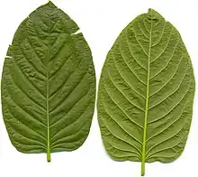 Mitragyna speciosa is an evergreen tree in the genus Mitragyna that can grow to a height of 25 m (82 ft). Its trunk may grow to a 0.9 m (3 ft) diameter.[27] The trunk is generally straight, and the outer bark is smooth and grey.[27] The leaves, ovate-acuminate in shape and opposite in growth pattern, are dark green, glossy on their upper surfaces,[10] and can grow to over 14–20 cm (5.5–7.9 in) long and 7–12 cm (2.8–4.7 in) wide. They have 12 to 17 pairs of veins.[27] The spherical inflorescences, which are deep yellow, grow in clusters of three at the ends of the branches.[28] The calyx-tube is 2 mm (0.08 in) long and has five lobes; the corolla-tube is 2.5–3 millimetres (0.098–0.12 in) long.[27]