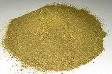 Many of the key psychoactive compounds in M. speciosa are indole alkaloids related to mitragynine, which is a tetracyclic relative of the pentacyclic indole alkaloids, yohimbine and voacangine.[10] In particular, mitragynine and 7-hydroxymitragynine (7-HMG) compose significant proportions of the natural products isolable from M. speciosa; e.g., in one study, mitragynine was 12% by weight from Malaysian leaf sources, versus 66% from Thai sources, and 7-hydroxymitragynine constituted ~2% by weight.[10][71] In addition, at least 40 other compounds have been isolated from M. speciosa leaves,[29] including ~25 additional alkaloids, including raubasine/ajmalicine (originally isolated from Rauvolfia serpentina), corynantheidine (also found in Corynanthe johimbe),[64] as well as mitraphylline, mitragynine pseudoindoxyl, and rhynchophylline.[72][73]