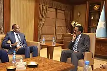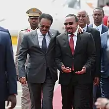In February 2020, a meeting between Mohamed and Muse Bihi Abdi, the President of the Republic of Somaliland,[45] was brokered by Abiy Ahmed, the Prime Minister of Ethiopia, to discuss unification. No agreement was reached.[46] 70% of the population were born since the Declaration of Independence in 1991, which despite prevailing issues such as clan based politics, women's rights and unemployment, marked the start of an era of 30 years of peace in Somaliland.[47] In April 2021 Muse blamed Mohamed for on going unrest in Somalia.[48]