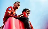 In early April 2018, he scored in both Champions League quarter-final matches against Manchester City to help his side advance.[135] On 22 April 2018, Salah was awarded the PFA Players' Player of the Year award,[136] having earlier been named in the PFA Team of the Year for the Premier League.[137] Two days later, he scored a brace in a 5–2 Champions League semi-final first leg win over former club, Roma. In doing so, he simultaneously became the first player from Africa and the first Liverpool player to score 10 goals in a single campaign in the tournament. His double also took him to 43 goals for the season across all competitions, surpassing Roger Hunt's tally of 42, and making him Liverpool's second-highest goalscorer in a single season, behind Ian Rush.[138] He had previously also broken the club's record for the Premier League era, surpassing Robbie Fowler's total of 36 goals set in the 1995–96 campaign, and Fernando Torres' record of 33 for the most goals by a Liverpool player in a debut season.[139] After his two goals and assists in the first leg against Roma, Salah featured in the second leg as Liverpool beat Roma 7–6 on aggregate to qualify for the final for the first time in eleven years.[140] He would then become the Premier League's all-time goalscorer for a 38-game season, registering his 32nd league goal in a 4–0 win against Brighton & Hove Albion en route to being awarded the Premier League Golden Boot.[141]