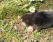 Moles are small mammals adapted to a subterranean lifestyle. They have cylindrical bodies, velvety fur, very small, inconspicuous eyes and ears,[1] reduced hindlimbs, and short, powerful forelimbs with large paws adapted for digging.