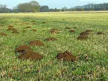 Other humane options are also possible including humane traps that capture the mole alive so it may be transported elsewhere.[21] In many contexts including ordinary gardens, the damage caused by moles to lawns is mostly visual, and it is possible instead of extermination to simply remove the earth of the molehills as they appear, leaving their permanent galleries for the moles to continue their existence underground.[21] However, when the tunnels are near the surface in soft ground or after heavy rain, they may collapse, leaving (small) unsightly furrows in the lawn.