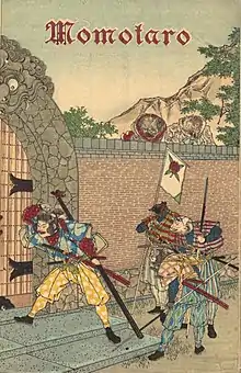 Iwaya had already published a version of "Momotaro" (1894) for his Nihon mukashibanashi (Japanese Folktales), where Momotaro is cast as a military soldier or commander (shōgun) of Great Japan (Dainihon), dispatched on a punitive campaign to quell the ogres who live in the northeast.[30][31] Older texts took the punishing of oni for granted and dispensed with explaining what crimes the oni committed to deserve condemnation. But in Iwaya's version, the ogres were explicitly stated as being evil beings, who devoured the "poor people" and taken "plunder" from the Emperor's land of Japan (Ozaki's translation[32]), thus morally justifying Momotaro's expedition.[31][33] It has been suggested these ogres represented the Qing dynasty of China since the publication occurred in the year of outbreak of the Sino-Japanese War.[34]