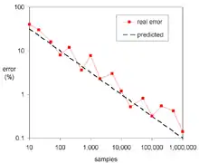 In principle, Monte Carlo methods can be used to solve any problem having a probabilistic interpretation. By the law of large numbers, integrals described by the expected value of some random variable can be approximated by taking the empirical mean (a.k.a. the 'sample mean') of independent samples of the variable. When the probability distribution of the variable is parameterized, mathematicians often use a Markov chain Monte Carlo (MCMC) sampler.[3][4][5] The central idea is to design a judicious Markov chain model with a prescribed stationary probability distribution. That is, in the limit, the samples being generated by the MCMC method will be samples from the desired (target) distribution.[6][7] By the ergodic theorem, the stationary distribution is approximated by the empirical measures of the random states of the MCMC sampler.
