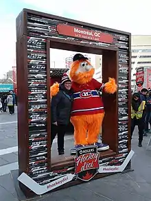 Beginning in the 2004–05 NHL season, the Canadiens adopted Youppi! as their official mascot, the first costumed mascot in their long history. Youppi was the longtime mascot for the Montreal Expos baseball team but was dropped from the franchise when they moved to Washington, D.C. in 2004–05 and became the Washington Nationals. With the switch, Youppi became the first mascot in professional sports to switch leagues. He is also the first mascot in professional sports to get ejected from a game.[67] In June 2020, Youppi became the first mascot from a Canadian-based club to be honoured in The Mascot Hall of Fame. Youppi's induction in the Mascot Hall of Fame was decided by a long voting process, which included the public vote.[68][69]