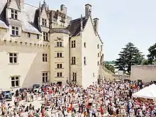 Jean IV de Chambes inherited the Château de Montsoreau and saw his lands erected in barony in 1560.[22] Montsoreau is looted by Protestants in 1568; the collegiate Sainte Croix and the fortifications of the city are destroyed. Four years later, on 26 August 1572, Puygaillard sent Jean IV de Chambes the order to eliminate the Huguenots from Saumur, then to do the same in Angers.[23] Four days after Saint Bartholomew's Day Massacre (24 August 1572), Jean de Chambes arrived in Saumur and killed François Bourneau, lieutenant-general of the city. Cruel and ruthless, Jean de Chambes fought at the siege of Lusignan and the capture of Fontenay-le-Comte, and was reigning terror in the region. The Reformed Church of Saumur was almost eliminated.[24] He then went to Angers, closed the gates of the fortifications and began the gathering of Huguenot personalities, all of whom he killed with his own hands.[25] Warned of the abuses and violence of his governor, Charles IX finally sent him a call to order on 14 September 1572. In 1573, his Barony was raised to the rank of County.[26][27]