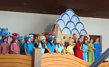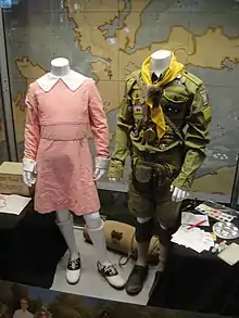 Kasia Walicka-Maimone was the costume designer. Anderson presented her with concepts of how the characters should look. She drew on photographs from the 1960s and the uniforms of Boy Scouts when designing Suzy and Sam's costumes. (Their characters inspired many Halloween costumes in 2012.)[21] While the filmmakers planned to model the animal costumes on those in real Noye's Fludde productions, they decided instead to fashion them as if they were made for U.S. schools, consulting photographs from Anderson's former school.[20]