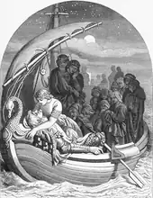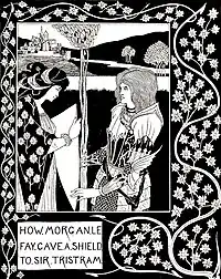 In Malory's backstory, Morgan has studied astrology as well as nigremancie (which might actually mean black magic in general rather than "necromancy"[100]) in the nunnery where she was raised, before being married to Urien (Uriens) as a young teenager; in this narrative she did not study with Merlin.[60] Unlike Malory's good sorceress Nimue, Morgan deals mostly in "black" rather than "white" magic, employed usually through enchantments and potions.[5] Her powers, however, seem to be inspired by fairy magic of Celtic folklore rather than by medieval Christian demonology.[34] Malory mentions Arthur's attempts to conquer at least one of her castles, which originally had been his own gift to her, and which he could not retake (apparently due to magical defences[98]). She also plots an elaborate ambush in "The Book of Sir Tristram de Lyons", after learning of the death of one of her favourites in a tournament, but Tristan ends up killing or routing thirty of her knights when the ambush ends in a disaster. Morgan is widely feared and hated, so much that "many knights wished her burnt." She is now the leader of the four (not three) witch queens who capture Lancelot (the others being the Queen of the Northgales, the Queen of Eastland, and the Queen of the Outer Isles). In an episode that had been first introduced by the anonymous writer of the earlier Prose Lancelot, Lancelot rescues Elaine of Corbenic from being trapped in an enchanted boiling bath by Morgan and the Queen of the Northgales, both envious of Elaine's great beauty (echoing Circe's treatment of Scylla[7]). Malory also reused the magic mantle assassination plot from the Huth Merlin in a slightly modified form, resulting in Morgan's damsel instantly burnt to cinders by its curse when she is forced to take it on. However, despite all of their prior hostility towards each other and her numerous designs directed against Arthur personally (and his own promise to get a terrible revenge on her as long as he lives[60]), Malory's Morgan is still redeemed and is one of the four grieving enchantress queens (the others being Nimue, marking the end of conflict between her and Morgan,[101] and two of Morgan's allies, the Queen of the Northgales and the Queen of the Wasteland) who arrive in a black boat to transport the wounded king to Avalon in the end. Unlike in the French and earlier stories on which Le Morte d'Arthur is based, and where Morgan and Arthur usually would either have first made peace or have just never fought to begin with, here her change of attitude towards him is sudden and unexplained (similar to the Post-Vulgate).[4][60][102] Arthur is last seen in Morgan's lap, with her lament of sorrow referring to him as her "dear brother" (dere brothir), as they disappear from the work's narrative together.