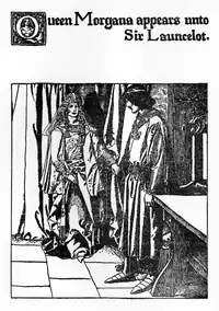 Morgan uses her skills in her dealings, amorous or otherwise, with several of Arthur's Knights of the Round Table. It applies in particular to the greatest of them all, Lancelot, whom she alternately tries to seduce and to expose as Guinevere's adulterous lover. Her magic aside, Lancelot is always disempowered in his dealings with Morgan as he could never hurt a woman, which, coupled with her being his king's kin, made the Vulgate's Morgan a perfect foil for Lancelot as "the woman he most feared in the world."[7][84] As told in the Prose Lancelot, they first meet in her magical domain known as the Val sans Retour (the Vale of No Return), serving as an enchanted prison for false lovers since she took an unnamed knight as her lover but then discovered his affair with another woman.[7] There, Lancelot frees the 250 unfaithful knights entrapped by Morgan, including her former lover Guiomar whom she has turned to stone for his infidelity,[42] but Morgan then captures Lancelot himself under her spell, using a magic ring and keeps him prisoner in the hope Guinevere would then go mad or die of sorrow. She also otherwise torments Guinevere, causing her great distress and making her miserable until the Lady of the Lake gives her a ring that protects her from Morgan's power.[85] Since then, Lancelot becomes Morgan's prime object of sexual desire but he consistently refuses her obsessive advances due to his great love of Guinevere, even as Morgan repeatedly courts, drugs, enchants or imprisons the knight. Their one-sided relationship (as well as interactions between her and Arthur[7]) may evoke that of the goddess Morrígan and the Celtic hero Cú Chulainn.[86] One time, she lets the captive Lancelot go to rescue Gawain when he promises to come back (but also keeping him the company of the most beautiful of her maidens to do "whatever she could to entice him"), and he keeps his word and does return; she eventually releases him altogether after over a year, when his health falters and he is near death.[87] On another occasion, Lancelot captured in Cart Castle (Charyot) by Morgan and her fellow magical queens, each of whom tries to make Lancelot her lover; he refuses to choose either of them and escapes with the help of one of their maidservants, Rocedon.[42]