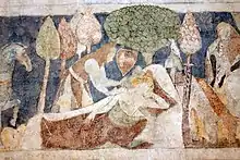 The 14th-century Italian romance titled La Pulzella Gaia (The Merry Maiden)[142] features the titular beautiful young fairy daughter of Morgana (Italian version of Morgan's name, here too also a sister of the Lady of the Lake) with Hemison. In her own tale, Morgana's daughter defeats Gawain (Galvano) in her giant serpent form before becoming his lover; she and her fairy army then save Gawain from the jealous Guinevere, who wants Gawain dead after having been spurned by him. She then herself is imprisoned in a magical torment in her mother's glass-and-diamond magical castle Pela-Orso, because of how Morgana wanted to force her to marry Tristan. Eventually, Gawain storms the castle after three years of siege and frees her from a cursed dungeon, also capturing her tyrannical mother for the same punishment.[143][144] The 15th-century Italian compilation of Arthur and Tristan legends, La Tavola Ritonda (The Round Table), too makes Morgan a sister to the Lady of the Lake as well as to Arthur (about the fate of whom it says Morgan "brought him away to a little island in the sea; and there he died of his wounds, and the fairy buried him on that island"[145]). It is based on the French prose romances, but here Morgan is a prophetic figure whose main role is to ensure the fulfilment of fate.[89] Her daughter also appears, as Gaia Donzella, in the Tavola Ritonda, where she is kidnapped by the knight Burletta of the Desert (Burletta della Diserta) who wants to rape her but she is rescued by Lancelot. The Italian Morgana appears in a number of cantari poems of the 14th to 15th century. Some of these are original new episodes, such as the Cantari di Tristano group's Cantare di Astore e Morgana, in which Morgana heals the wounded Hector de Maris (Astore) but turns him evil, and gives him an armour made in Hell as well as a magical ship in her revenge plot against Gawain as well as Arthur himself, and the Cantari del Falso Scudo that features her evil fairy son, the Knight of the False Shield, who ends up slain by Galahad. Other include Lasencis, a standalone version of the Tavola Ritonda story of he eponymous Corsican knight armed by Morgan with enchanted weapons to avenge his brother killed by Lancelot, and a yet another telling of the familiar story of Morgana's good fairy daughter titled the Ponzela Gaia.[146][147][148][149][150] Evangelista Fossa combined and retold some of those in his Innamoramento di Galvano (Gawain Falling in Love, c. 1494).[151]