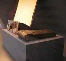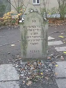 Mendelssohn died on 4 January 1786 as the result (it was thought at the time) of a cold contracted while carrying a manuscript (his reply to Jacobi, titled To Lessing's Friends (An die Freunde Lessings)) to his publishers on New Year's Eve; Jacobi was held by some to have been responsible for his death.[8] He was buried in the Jewish Cemetery of Berlin.[18] The translation of the Hebrew inscription on his gravestone (see picture to the right) reads: "H[ere] r[ests] / the wise R[eb] Moses of Dessau / born on the 12th of Elul 5489 [6 September 1729] / died on Wednesday the 5th of Shevat [4 January] / and buried the next morning on Thursday 6th/ 5546 [5 January 1786] / M[ay] H[is] S[oul be] B[ound up in the] B[ond of eternal] L[ife]".[19] Although the cemetery was largely destroyed during the Nazi era, after German reunification, in 2007-2008, it was reestablished with monuments to its past, including a recreation of Mendelssohn's gravestone.