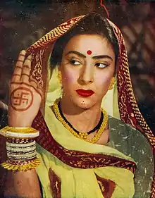 Nargis was the director's first choice for the role of Radha,[2] and despite only being aged 26 at the time, she played the new wife, young single mother and an aged mother of two sons.[19] Nargis—the reigning queen of Hindi cinema at the time[20]—had started her career in a leading role with Khan's Taqdeer (1943) and acted under his direction in Humayun (1945) and Andaz (1949).[21] Mother India is generally regarded as Nargis's best performance and was her last major film before retirement after marriage.[22]