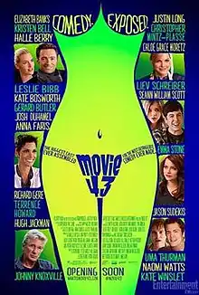 Movie 43 is a 2013 American anthology comedy film conceived by producer Charles B. Wessler. The film features fourteen different storylines, each one by a different director, including Elizabeth Banks, Steven Brill, Steve Carr, Rusty Cundieff, James Duffy, Griffin Dunne, Patrik Forsberg, James Gunn, Bob Odenkirk, Brett Ratner, Will Graham, and Jonathan van Tulleken. It stars an ensemble cast that is led by Banks, Kristen Bell, Halle Berry, Gerard Butler, Seth MacFarlane, Leslie Bibb, Kate Bosworth, Josh Duhamel, Anna Faris, Richard Gere, Terrence Howard, Hugh Jackman, Johnny Knoxville, Justin Long, Christopher Mintz-Plasse, Chloë Grace Moretz, Chris Pratt, Liev Schreiber, Seann William Scott, Emma Stone, Jason Sudeikis, Uma Thurman, Naomi Watts and Kate Winslet. Julianne Moore, Tony Shalhoub, Bob Odenkirk, Anton Yelchin and Shane Jacobson also appear in storylines not included in the film's theatrical release.