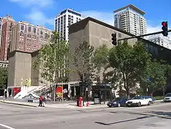 The current location at 220 East Chicago Avenue is in the Streeterville neighborhood of the Near North Side community area.[2] Josef Paul Kleihues designed the current building after the museum conducted a 12-month search, reviewing more than 200 nominations.[3] The museum was initially located at 237 East Ontario Street, which was originally designed as a bakery. The current building is known for its signature staircase leading to an elevated ground floor, which has an atrium, the full glass-walled east and west façades giving a direct view of the city and Lake Michigan.