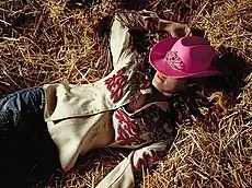 For the album artwork, Madonna wears a blue sequin shirt, embellished jeans, red high heels and a blue cowboy hat. In it, she faces the camera, while in the background a car and a house are seen. In other pictures from the same shoot, Madonna is photographed lying on a bed of hay and wearing a fringed, rhinestone encrusted cowboy shirt, embellished jeans, gold mules and a pink cowboy hat and tiara. The country was a constant theme throughout the design, as the album's title, which was a logo that simulated a buckle, showing the silhouette of a cowboy while riding a horse and a yellow background; the bright colors give a sharp contrast compared to the photograph.[25] Photo sessions were conducted by Jean Baptiste Mondino, who had worked previously with the singer on photoshoots and music videos.[26] According to Fouz-Hernández, the artwork is "a complete celebration to the field" western United States.[27] He also added that it was "distinctly camp", and notably Madonna's "combination of Western clothing with expensive shoes and bright red high heels". He pointed out that there was "a clear evocation of Judy Garland – a major gay icon – in the artwork".[28] The art direction and design for the album were done by Kevin Reagan.[29]