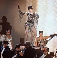 In 2012, Madonna included the song on her Super Bowl XLVI halftime show set list, where it was remixed with LMFAO's "Party Rock Anthem" and "Sexy and I Know It".[137] The same year, she performed it on The MDNA Tour at New York City's Madison Square Garden, on November 13. She invited South Korean rapper Psy and performed together his song "Gangnam Style" and her 2008 single, "Give It 2 Me".[138] "Music" opened the final section of the Rebel Heart Tour (2015–2016), with Madonna decked in a "Harlem-flapper-meets-Paris-in-the-Twenties" dress, adorned with thousands of Swarovski crystals.[139] The song "began as a Jazz Age ballad before kicking into banger mode".[140] Madonna's dancers were dressed in Golden Twenties inspired costumes with one of them topless.[140][141] Joe Lynch from Billboard, opined that "the presence of 'Music' was an effective reminder that while some compulsive naysayers tsk the Queen of Pop for trend chasing with Diplo, she brought techno to the pop mainstream years before EDM was an ubiquitous term".[140] The performance of the song at the March 19–20, 2016 shows in Sydney's Allphones Arena was recorded and released in the live album, Rebel Heart Tour.[142] On December 6, 2016, Madonna performed "Music" during the Carpool Karaoke segment of The Late Late Show with James Corden.[143] On April 30, 2022, Madonna joined singer Maluma during his Medallo en el mapa concert in Medellín, Colombia to perform "Music" along with their 2019 single "Medellín".[144]