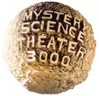 The show's theme song, the "Love Theme from Mystery Science Theater 3000", was written by Hodgson and Weinstein, which helped to cement some of the broader narrative elements of the show, such as the Mads and Joel being part of an experiment.[11] The song was composed by Charlie Erickson with help from Hodgson in the style of Devo, The Replacements, and The Rivieras (particularly their cover of the song "California Sun") and sung by Hodgson.[11][12] Initial shows used foam letters to make the show's title, but they later created the spinning-moon logo out of a 2-foot (0.6m) diameter fiberglass ball, covered with foam insulation and the lettering cut from additional foam pieces. Hodgson felt they needed a logo with the rotating effect as opposed to a flat 2D image, and though they had envisioned a more detailed prop, with the letters being the tops of buildings on this moon, they had no time or budget for a project of that complexity and went with what they had.[16] Musical numbers would also be used as part of the host segments, which Hodgson said came out naturally from the riffing process; they would find themselves at times singing along with the movie instead of just riffing at it, and took that to extend songs into the host segments.[11]
