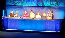 Behind the scenes, the lead writer was Elliott Kalan, former head writer for The Daily Show with Jon Stewart and host of The Flop House, a podcast about bad movies.[68] Dan Harmon and Joel McHale also wrote for the show, along with the on-screen cast members.[60][69] Hodgson also brought in guest writers for certain episodes that included Justin Roiland, Rob Schrab, Nell Scovell, Ernie Cline, Pat Rothfuss, Dana Gould, and Tammy Golden. Additionally, Paul & Storm and Robert Lopez composed original songs for the new episodes.[70]