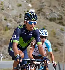 Quintana finished 3rd in the general classification of the Tour de France after suffering from allergies throughout much of the tour; Movistar Team won the team classification for the second year in a row. After the tour Quintana stated, "I won't take part in the Olympic Games. I want to recover and be ready for the Vuelta a España to give emotions and animate the race."[48] Quintana succeeded with this strategy and won the Vuelta a España ahead of Chris Froome with the Colombian Esteban Chaves finishing third.[49] Quintana had gained over 2+1⁄2 minutes over Froome on Stage 15 when he and Alberto Contador (Trek–Segafredo) attacked together from 10 kilometres (6.2 miles) into the stage and blew the race apart, isolating Froome from his Team Sky teammates. Whilst Froome fought back and managed to gain back nearly all he had lost in a dominant victory on the stage 19 individual time trial to Calp, Quintana was able to follow several attacks by Froome on Stage 20, the final mountain stage to Alto de Aitana, to secure overall victory by 1:23 over Froome. By doing so, Quintana became the second Colombian after Luis Herrera in 1987 to win the Vuelta.[50]