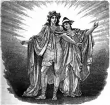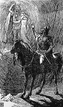 Sent by Baldr's mother, the goddess Frigg, the god Hermóðr rides to the place Hel to resurrect Baldr. Hermóðr finally arrives in Hel to find Baldr in a hall, seated in the seat of honor and with his wife Nanna. Hermóðr bargains with the goddess Hel for Baldr's resurrection. Hel and Hermóðr come to an agreement and then Baldr and Nanna accompany Hermóðr out of the hall.
