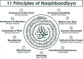 The Naqshbandi order has eleven principle teachings known as the Eleven Naqshbandi principles. The first eight were formulated by Abdul Khaliq Gajadwani, and the last three were added by Baha-ud-Din Naqshband Bukhari.[7]