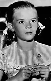 A few weeks before her fifth birthday, Wood made her uncredited film debut in a fifteen-second scene in the film Happy Land (1943). Despite the brief part, she attracted the notice of the director, Irving Pichel.[26] He remained in contact with Wood's family for two years, advising them when another role came up. The director telephoned Wood's mother and asked her to bring her daughter to Los Angeles for a screen test. Wood's mother became so excited that she "packed the whole family off to Los Angeles to live," writes Harris. Wood's father opposed the idea, but his wife's "overpowering ambition to make Natalie a star" took priority.[27] According to Wood's younger sister Lana, Pichel "discovered her and wanted to adopt her."[28]