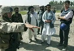 In November 2009, 1/5 was replaced by 1st Battalion, 3rd Marines.[16][17] In the late summer and early fall the Marines detained Haji Adam, one of Nawa's main drug lords, and turned his house into Combat Outpost (COP) Sullivan.[18] In November two local officials were assassinated.[19] On December 17, 2009, Admiral Mike Mullen, the Chairman of the Joint Chiefs of Staff, visited Patrol Base Jaker and touted the security gains by touring the Nawa district center without wearing body armor.[20] Several weeks later Afghan President Hamid Karzai and ISAF commander General Stanley McChrystal also visited Nawa on January 2, 2010.[2]