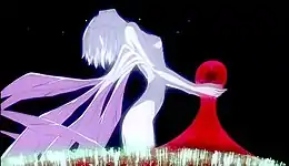 Gainax involved the studio Production I.G, which had previously collaborated on some episodes of the original series.[37] Staff also decided to improve the quality of the segment of "Air" already included in "Rebirth". The movie was realized with computer graphics (CG) to give depth to the images and exceed the quality of animation of the original television series.[82] The most important contribution came from the studio Omnibus Japan, which worked on Patlabor 2: The Movie (1993) and Ghost in the Shell (1995). Most of the computer graphics sequences were included at the beginning of the Human Instrumentality and the Third Impact scenes, in which the globe is sprinkled with cruciform lights.[83] The companies divided the tasks by their technical needs and stylistic choices of the scenes. The Production I.G worked on the scenes with 3D computer graphics, which were virtually impossible to achieve with traditional methods, such as the introductory frames of the nine units of the Eva Series, while Gainax studio made scenes that required 2D computer graphics, such as those with computer screens.[37] The sequences of the clash between Unit 02 and the Strategic Self-Defense Forces evoke those of the battle between the Angel Sachiel and the United Nations troops in "Angel Attack", the first episode of the original animated series.[84] While making the feature film, images shown in the original twenty-fifth episode were also added, such as that of Eva-02 and Asuka at the bottom of a lake, and the corpses of Ritsuko and Misato.[53][85] Besides the CG, short frames with watercolors were also inserted during the Instrumentality scene.[86]