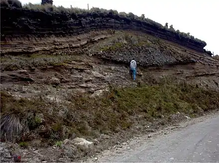 The first eruptions of Nevado del Ruiz occurred about 1.8 million years ago at the beginning of the Pleistocene epoch.[8] Three primary eruption periods in the history of the massif have been identified: ancestral, older and present. During the ancestral period between one million to two million years ago, a complex of large stratovolcanoes was created.[5] Between 1.0 million and 0.8 million years ago, they partially collapsed, forming large (5–10 km wide) calderas. During the older period, which lasted from 0.8 million to 0.2 million years ago, a new complex of large stratovolcanoes developed (including Older Ruiz, Tolima, Quindio, and Santa Isabel). Once again explosive summit calderas formed from 0.2 million to 0.15 million years ago.[5]