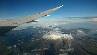 Like many other Anden volcanoes, Nevado del Ruiz is a stratovolcano: a voluminous, roughly conical volcano consisting of many strata of hardened lava and tephra including volcanic ash.[12] Its lavas are andesitic–dacitic in composition.[1] The modern volcanic cone comprises five lava domes, all constructed within the caldera of an ancestral Ruiz volcano: Nevado El Cisne, Alto de la Laguna, La Olleta, Alto la Pirana, and Alto de Santano.[13] It covers an area of more than 200 km2 (77 sq mi), stretching 65 km (40 mi) from east to west.[14] The mountain's broad summit includes the Arenas crater, which is 1 km (0.62 mi) in diameter and 240 m (790 ft) deep.[1] Nevado del Ruiz, as its neighbours to the southwest Nevado El Cisne and Nevado de Santa Isabel is located over the Palestina Fault that crosscuts the underlying El Bosque Batholith, dated at 49.1 ± 1.7 Ma.[15]