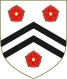 ![]() Arms: Arms of New College Oxford (arms of William of Wykeham): Argent, two chevronels sable between three roses gules barbed and seeded proper. | |