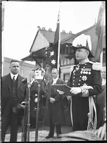 To mark the viceroy's presence at any building, ship, aeroplane, or car in Australia, the governor's standard or flag is employed. Following the example of other states adopting unique Governor's standards, in 1980 the Government of New South Wales sought to introduce a new standard for the governor to replace the Union Flag that had been in use since 1788.[9] Premier Neville Wran wrote to the Governor, Sir Roden Cutler, on 25 November 1980 advising: “His Excellency’s Ministers of State now consider that there should be a change in the Personal Standard of the Governor of New South Wales, such change to take effect at the conclusion of His Excellency’s term of office. The Premier therefore recommends for approval a change in the Governor’s distinctive flag from the Union Flag to the New South Wales State Flag with a Crown surmounting the State badge in the fly.” However, Cutler did not agree with this change, and it was recommended that the change be undertaken after he had left office.[9] The new Governor's Standard was designed and presented by the Garter King of Arms to the Agent-General for New South Wales in London on 8 January 1981, who then sought Royal assent of the new design, which was given on 15 January 1981.[9] The flag was first flown on 20 January 1981 over Parliament House for the official swearing-in of Governor Sir James Rowland, and was flown for the first time over Government House on 29 January 1981.[10][11]