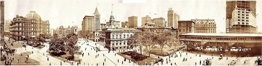 The area around City Hall is commonly referred to as the Civic Center. Most of the neighborhood consists of government offices (city, state, and federal), as well as an increasing number of upscale residential dwellings being converted from older commercial structures. Architectural landmarks surround City Hall, including St. Paul's Chapel, St. Peter's Church, the Home Life Building, the Rogers Peet Building, and the Woolworth Building to the west; the Broadway–Chambers Building to the northwest; 280 Broadway, 49 Chambers, Tweed Courthouse, and Surrogate's Courthouse to the north; the Manhattan Municipal Building to the northeast; the Brooklyn Bridge to the east; and the New York Times Building, the Potter Building, and the Park Row Building to the southwest. City Hall Park is approximately three blocks away from the World Trade Center to the west.[18] Pace University's New York City campus is located across Park Row from City Hall.[19]