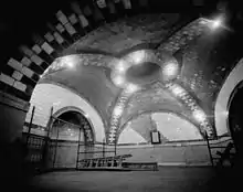 Located directly under City Hall Park is the former City Hall subway station, the original southern terminal of the first service of the New York City Subway built by the Interborough Rapid Transit Company (IRT). Opened on October 27, 1904,[20] this station beneath the public area in front of City Hall was designed to be the showpiece of the new subway. The platform and mezzanine feature Guastavino tile, skylights, colored glass tile work and brass chandeliers.[21] Passenger service was discontinued on December 31, 1945,[22] although the station is still used as a turning loop for 6 and <6> trains.[23]