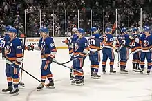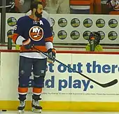 On September 10, 2013, Tavares was introduced as the 14th captain in New York Islanders history, replacing former Islander Mark Streit of the Philadelphia Flyers, who served as team captain since 2011.[131] After posting a 4–4–3 record in their first 11 games, the Islanders made a trade, sending fan favorite and three-time 30-goal scorer Matt Moulson, their 2014 first-round draft pick and their 2015 second-round draft pick to the Buffalo Sabres in exchange for Thomas Vanek, a highly regarded and dynamic goal scorer.[132][133] Despite chemistry with linemates Tavares and Kyle Okposo, however, his desire to test free agency and the team's impending move to Barclays Center[134] led to Vanek being dealt to the Montreal Canadiens at the trade deadline for Sebastian Collberg and a second-round pick in 2014.[135][136] After a season of player swapping and goaltending issues, they failed to qualify for the playoffs, finishing with a record of 34–37–11.[137]