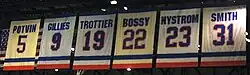 Ten former members of the Islanders have been inducted into the Hockey Hall of Fame, seven of whom—Mike Bossy, Clark Gillies, Denis Potvin, Billy Smith, Bryan Trottier, coach Al Arbour, and general manager Bill Torrey—were members of all four Cup-winning teams. Post-dynasty players Pat LaFontaine, Roberto Luongo and Pierre Turgeon were also inducted.